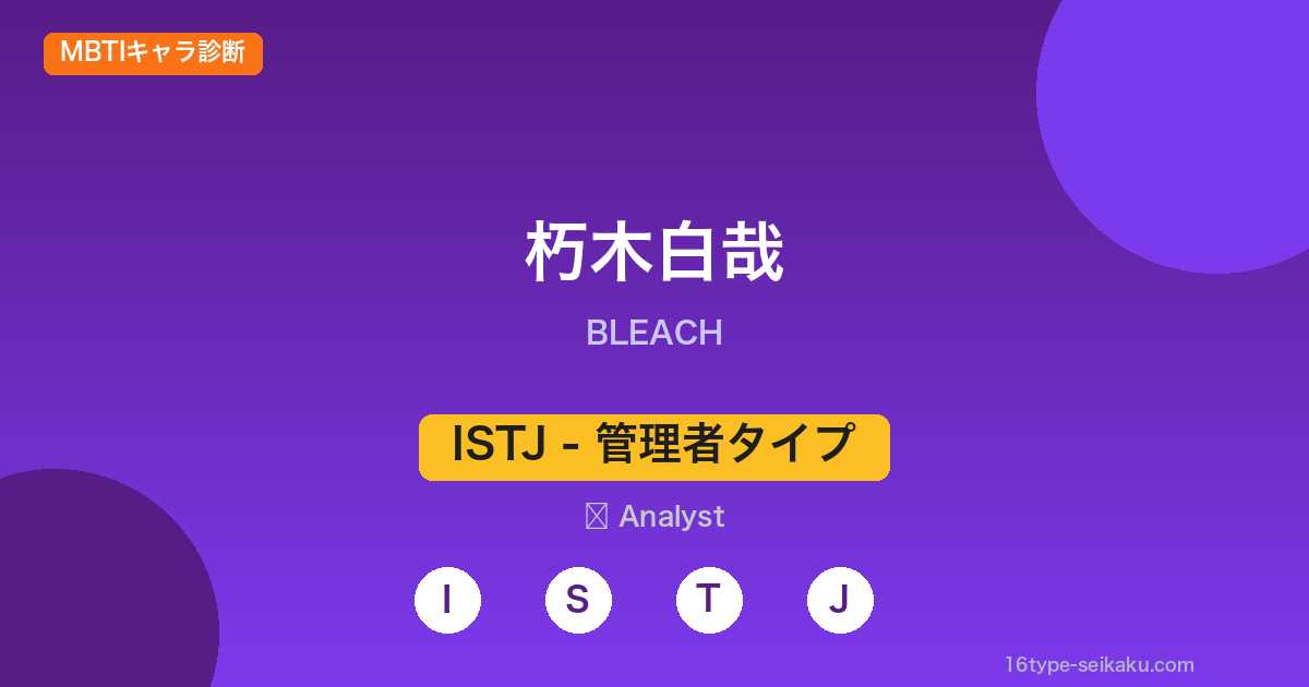 A. 白哉は規律と伝統を重んじ(SJ)、感情よりも論理で判断し(T)、内省的で計画的に行動する(IJ)という特徴があります。これらすべてがISTJ(管理者)タイプの中核的な特性と一致しています。特に「掟を守る」という一貫した行動原理は、ISTJの「確立されたルールへの忠誠」を最もよく表しています。