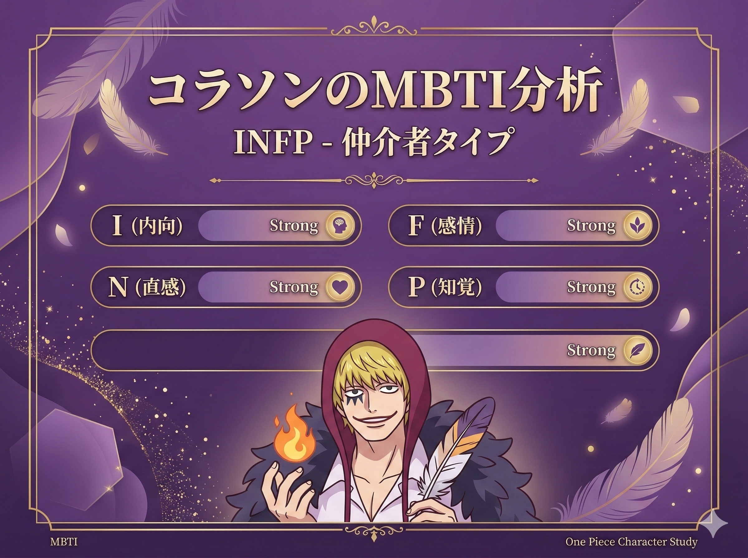 不器用で、ドジで、でも誰よりも深い愛を持った男。コラソンは、INFPタイプの最も美しい姿を見せてくれた、ワンピース屈指の名キャラクターなのです。