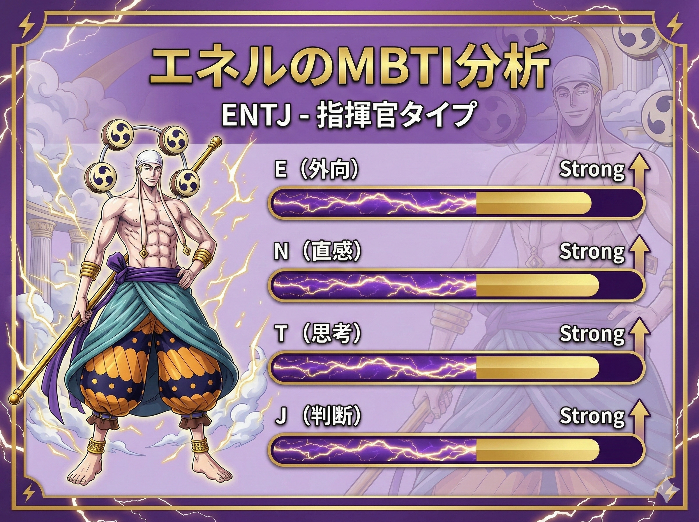 エネル(ゴッド・エネル)は、ENTJ(指揮官)タイプの特徴を見事に体現したキャラクターです。
