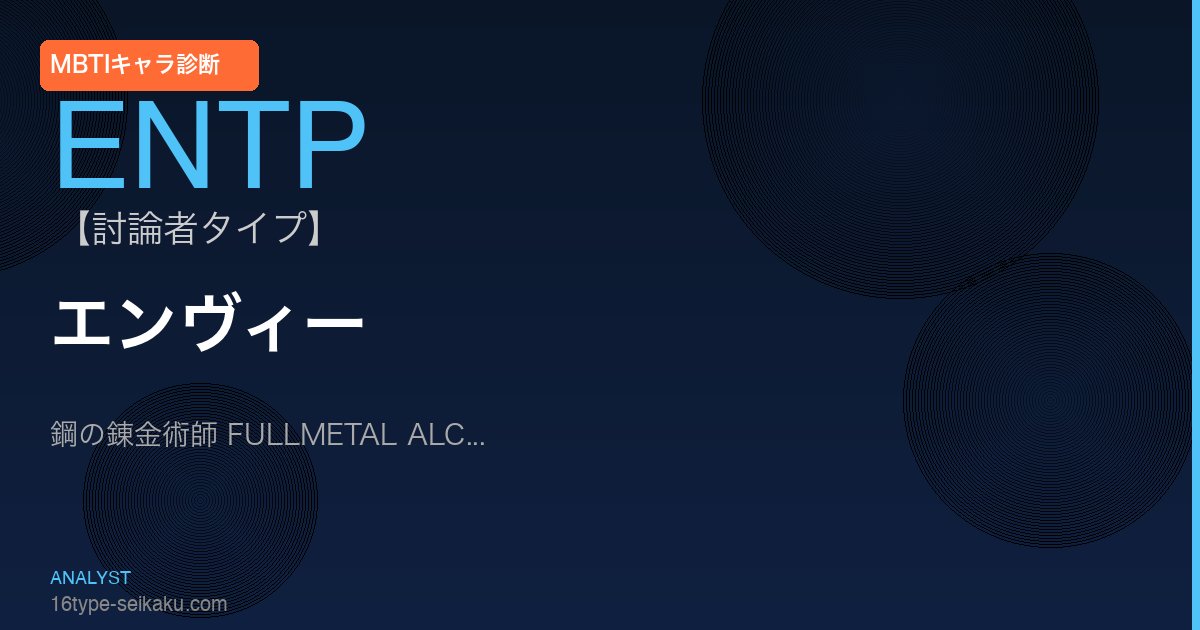 A. エンヴィーはE(外向型)・N(直感型)・T(思考型)・P(知覚型)の4特性を持ちます。鋼の錬金術師 FULLMETAL ALCHEMISTでの行動・判断・人間関係を総合的に分析するとENTP(討論者)タイプが最も適切です。