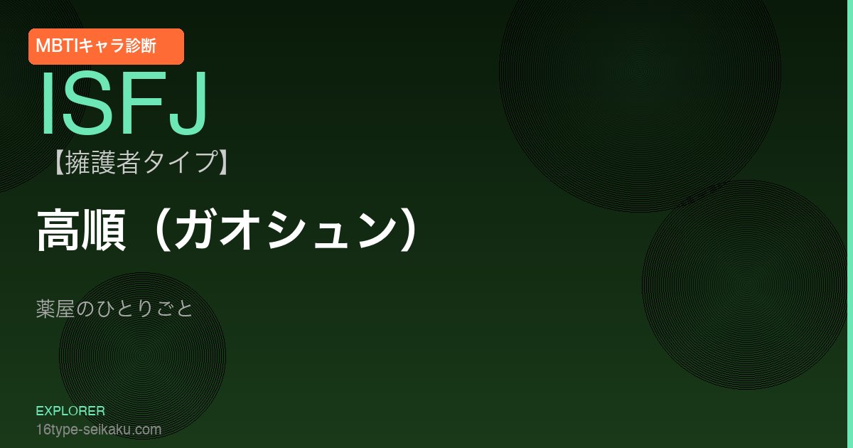 A. 高順(ガオシュン)はI(内向型)・S(感覚型)・F(感情型)・J(判断型)の4特性を持ちます。薬屋のひとりごとでの行動・判断・人間関係を総合的に分析するとISFJ(擁護者)タイプが最も適切です。