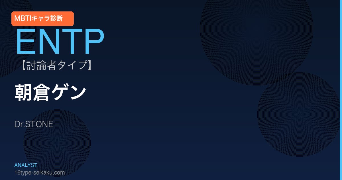 A. 朝倉ゲンはE(外向型)・N(直感型)・T(思考型)・P(知覚型)の4特性を持ちます。Dr.STONEでの行動・判断・人間関係を総合的に分析するとENTP(討論者)タイプが最も適切です。