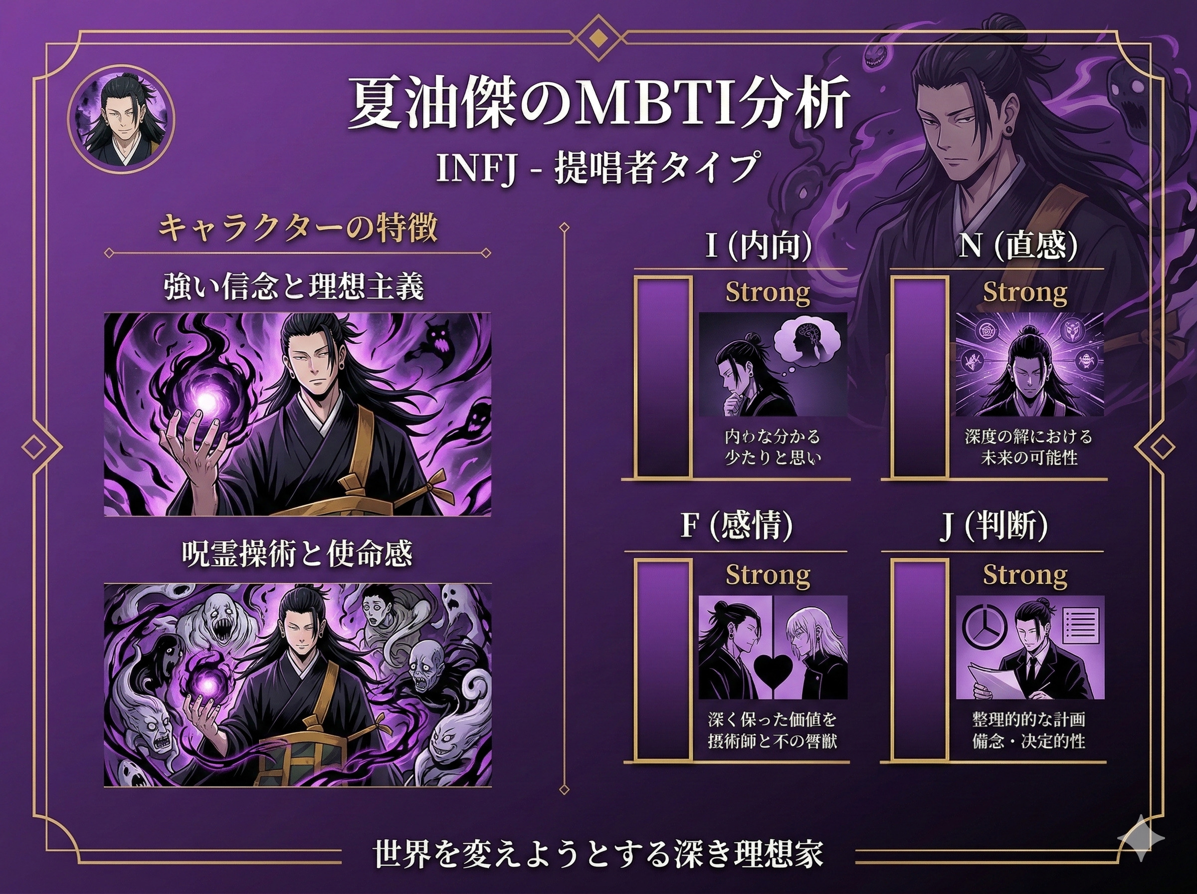 夏油傑は、INFJ(提唱者)の「光」と「闇」の両方を体現した、極めて奥深いキャラクターです。