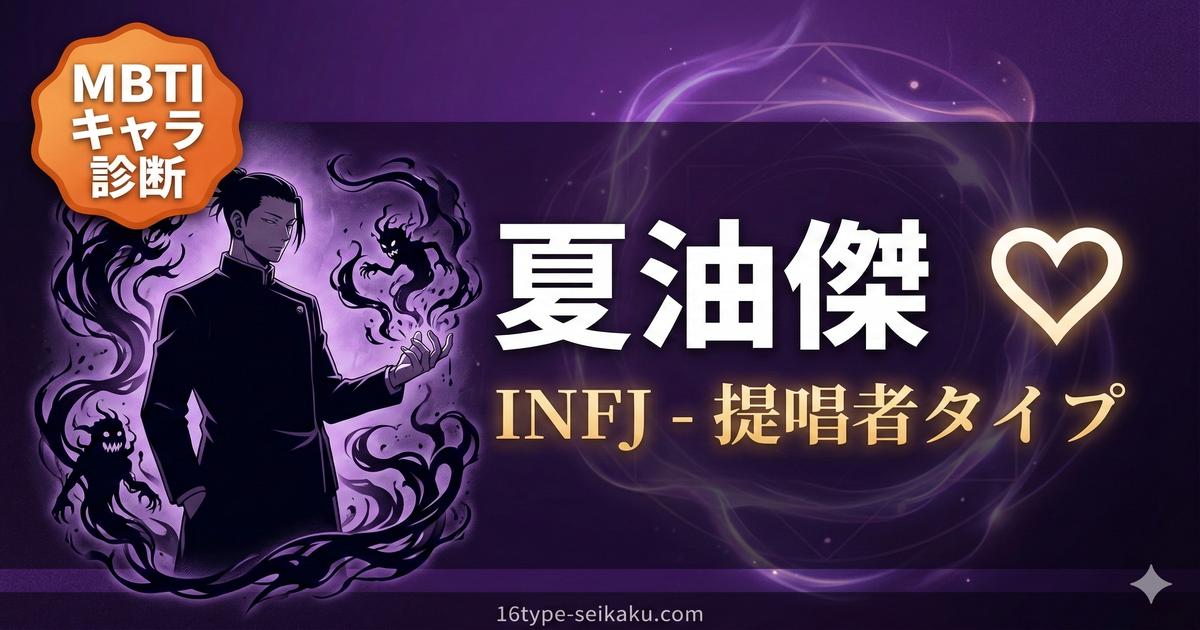 夏油傑は、深い理想主義(N)、他者への強い共感力(F)、孤独な内省傾向(I)、そして計画的な実行力(J)を持っています。特に「あるべき世界の姿」を追い求め、その実現のために行動する姿は、INFJ(提唱者)の典型的な特徴と一致しています。