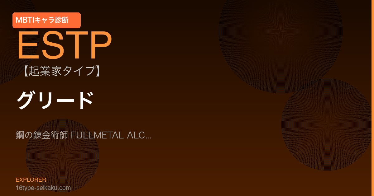 A. グリードはE(外向型)・S(感覚型)・T(思考型)・P(知覚型)の4特性を持ちます。鋼の錬金術師 FULLMETAL ALCHEMISTでの行動・判断・人間関係を総合的に分析するとESTP(起業家)タイプが最も適切です。