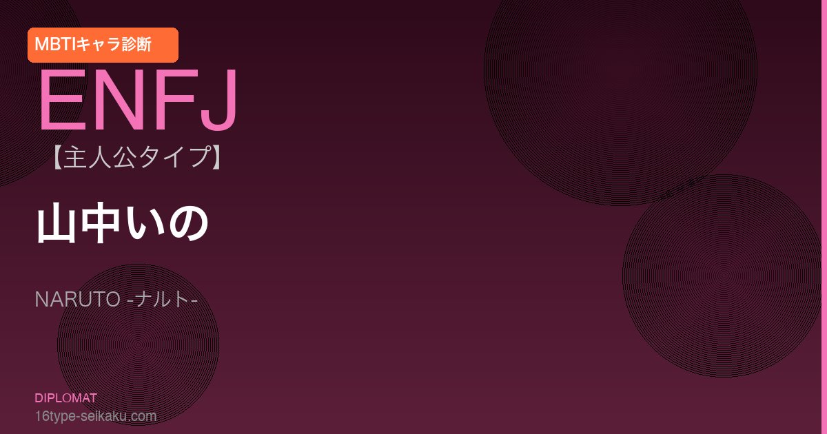 A. 山中いのはE(外向型)・N(直感型)・F(感情型)・J(判断型)の4特性を持ちます。NARUTO -ナルト-での行動・判断・人間関係を総合的に分析するとENFJ(主人公)タイプが最も適切です。