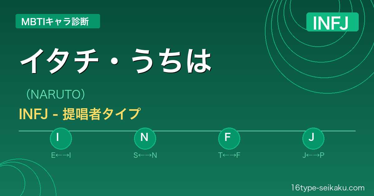 イタチは一見、冷静・論理的に見えるためINTJ(建築家タイプ)と誤解されることがありますが、イタチの最終的な判断基準は「論理」よりも「愛情と価値観(F)」にあります。サスケへの愛のために非合理に見える選択をしたこと、人の苦しみへの深い共感を持っていたことなどから、FタイプであるINFJの方が適切です。