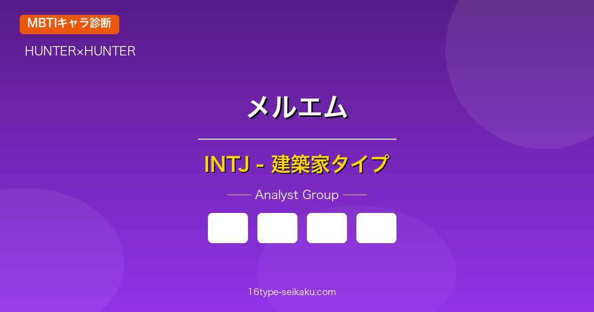 メルエムのMBTIタイプはINTJ(建築家)と分析されます。卓越した知性、長期的なビジョン、合理的な判断力、そして内面で繰り広げられる深い思索は、INTJの特徴と一致しています。