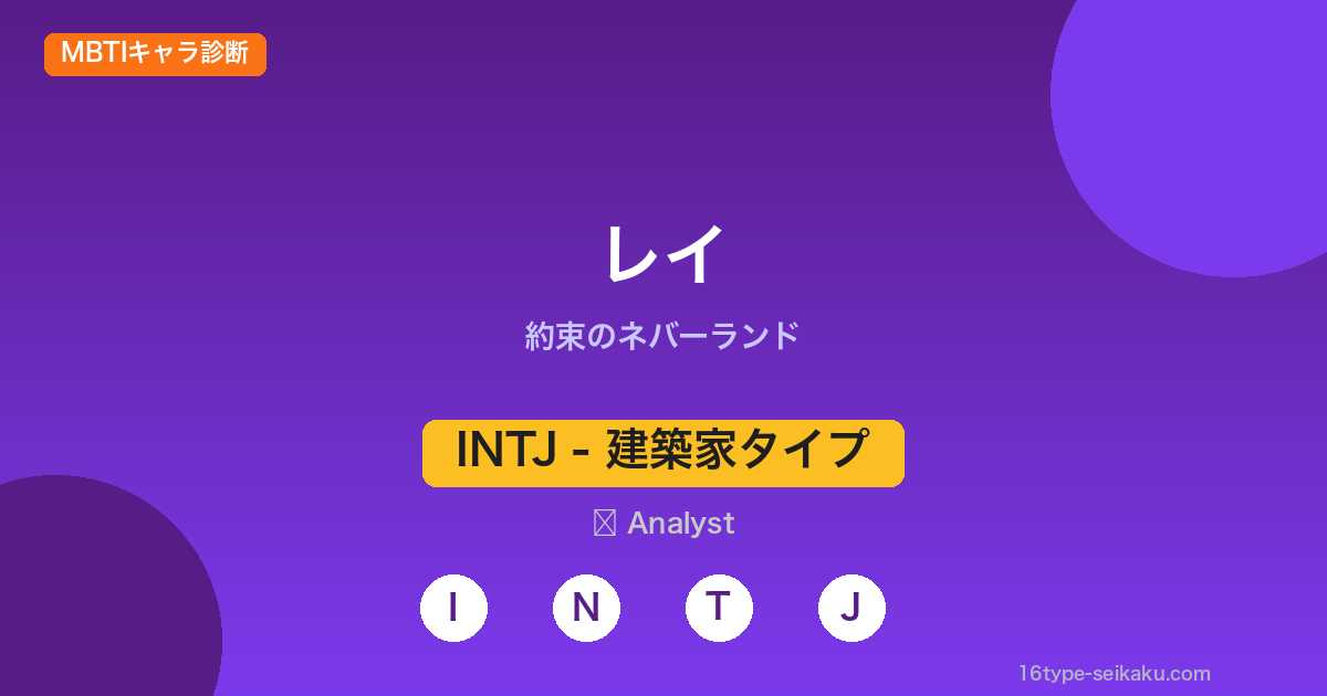 レイは内向的に思考を深め(I)、表面の奥にある構造を把握し(N)、論理的に最善策を判断し(T)、長期計画を着実に遂行する(J)という特徴を持っています。特に6年間に渡る綿密な脱出計画の立案と実行は、INTJの「建築家」としての特性を最もよく表しています。