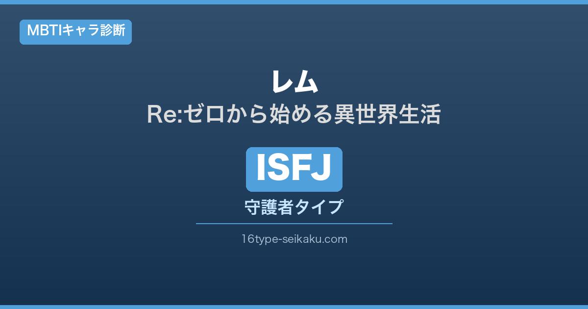 A. レムの行動・性格をMBTIの4軸で分析すると、内向型(I:慎重で内省的)・感覚型(S:現実的なサポートを重視)・感情型(F:愛情と価値観で動く)・判断型(J:決断に一貫性がある)の特性が一致するためです。複数のMBTI分析サイトでもISFJとして認定されており、ISFJキャラクターの代表格として広く認識されています。