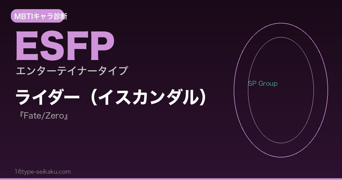 ESFPタイプは探検家(SP)グループに属し、ライダー(イスカンダル)はそのタイプの特性を最もわかりやすく体現しているキャラクターの一人です。読者・視聴者がライダー(イスカンダル)に強く共感したり、憧れたりするのは、こうしたESFP的な本質的魅力があるからこそでしょう。