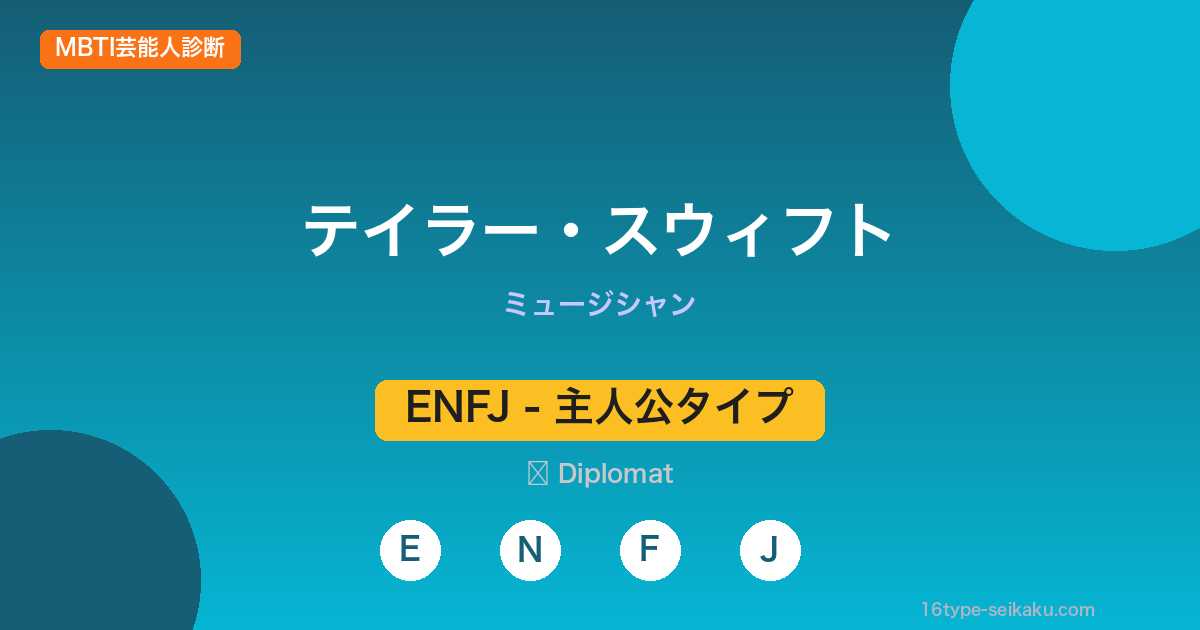 そんなテイラー・スウィフトをMBTI(16パーソナリティ)の観点から分析すると、彼女の性格タイプはENFJ(主人公タイプ)であると考えられます。人々を鼓舞し、導くことに長けたENFJの特徴が、テイラーの活動のあらゆる面に表れているのです。